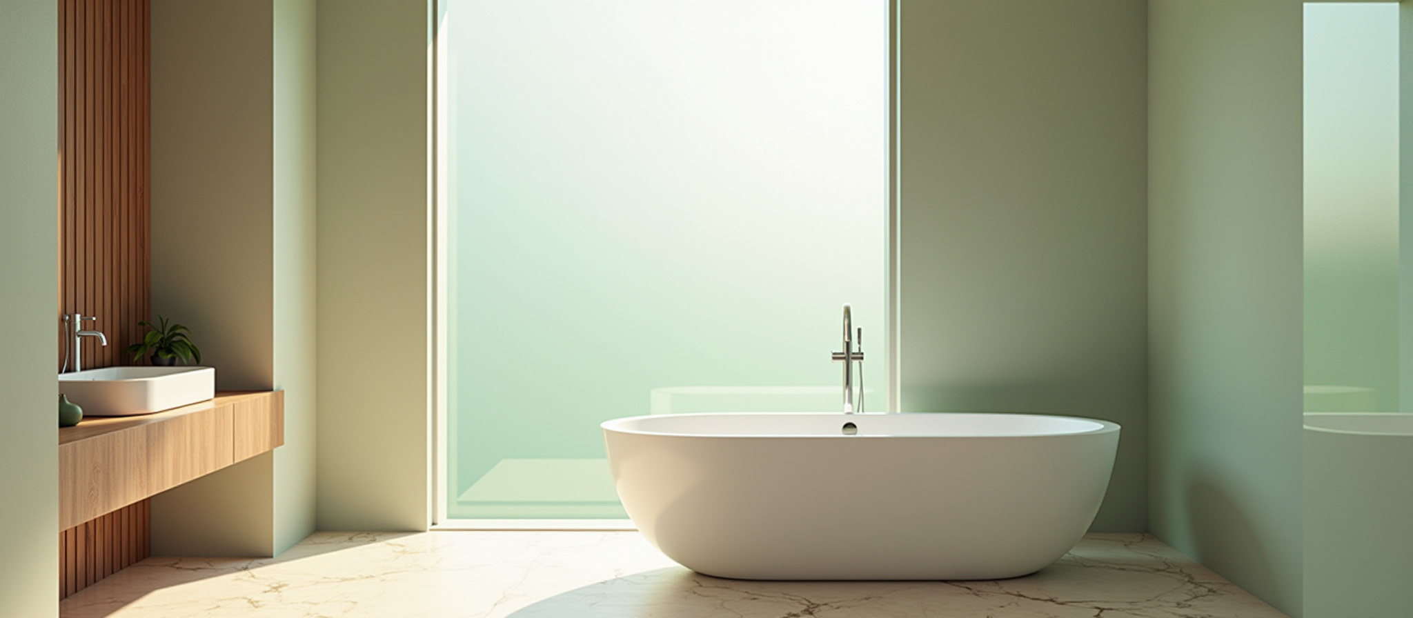 The natural wood accents bring subtle warmth and character to the soft green palette, while the sleek silver taps, shower fittings, and accessories add a refined, contemporary touch. Together, the blend of textures delivers a refreshing yet timeless style that enhances both comfort and sophistication.